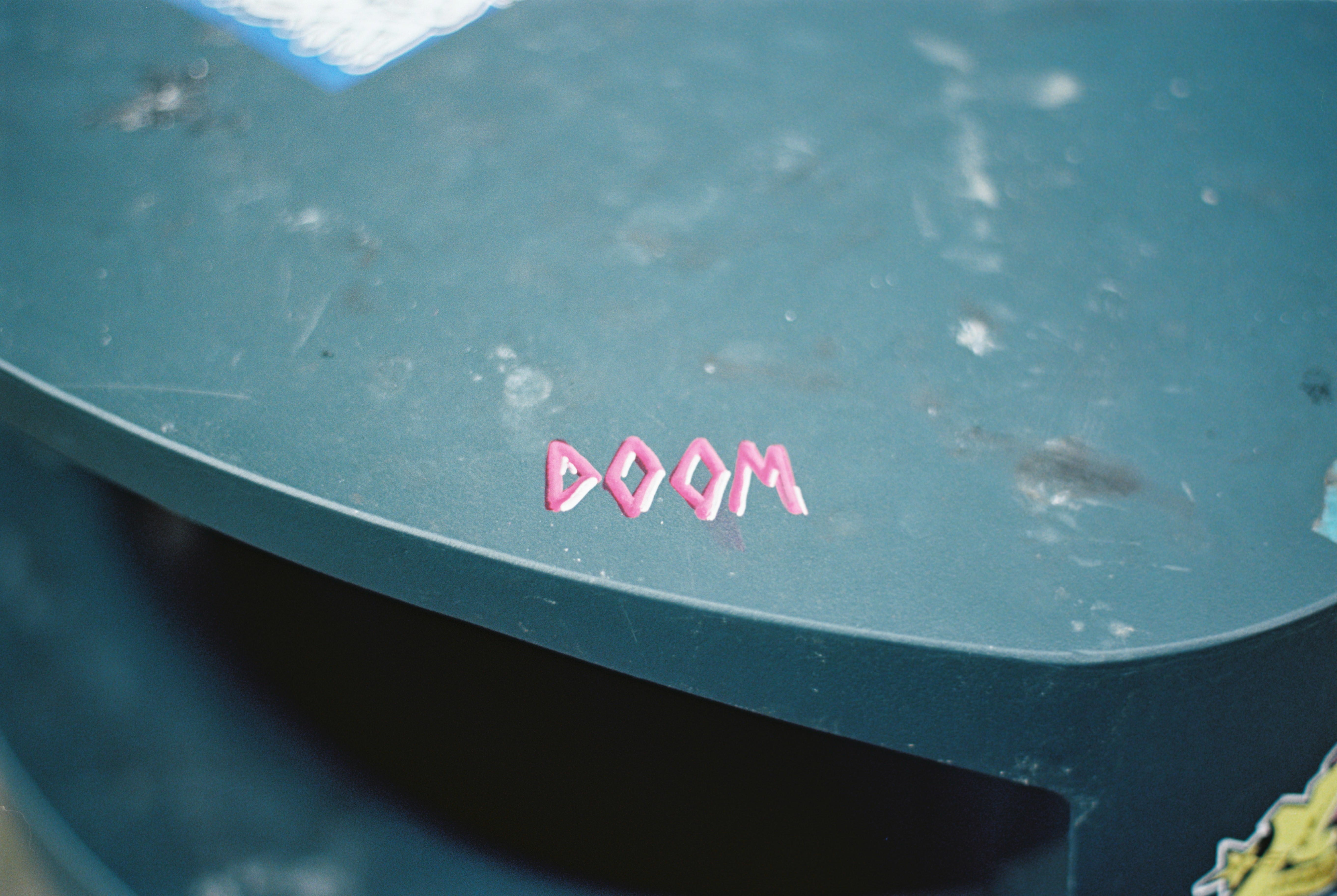 Fixed-gear in the wild – hands evidently shaking with excitement. Left a DOOM calling card from our earlier doodling workshop.