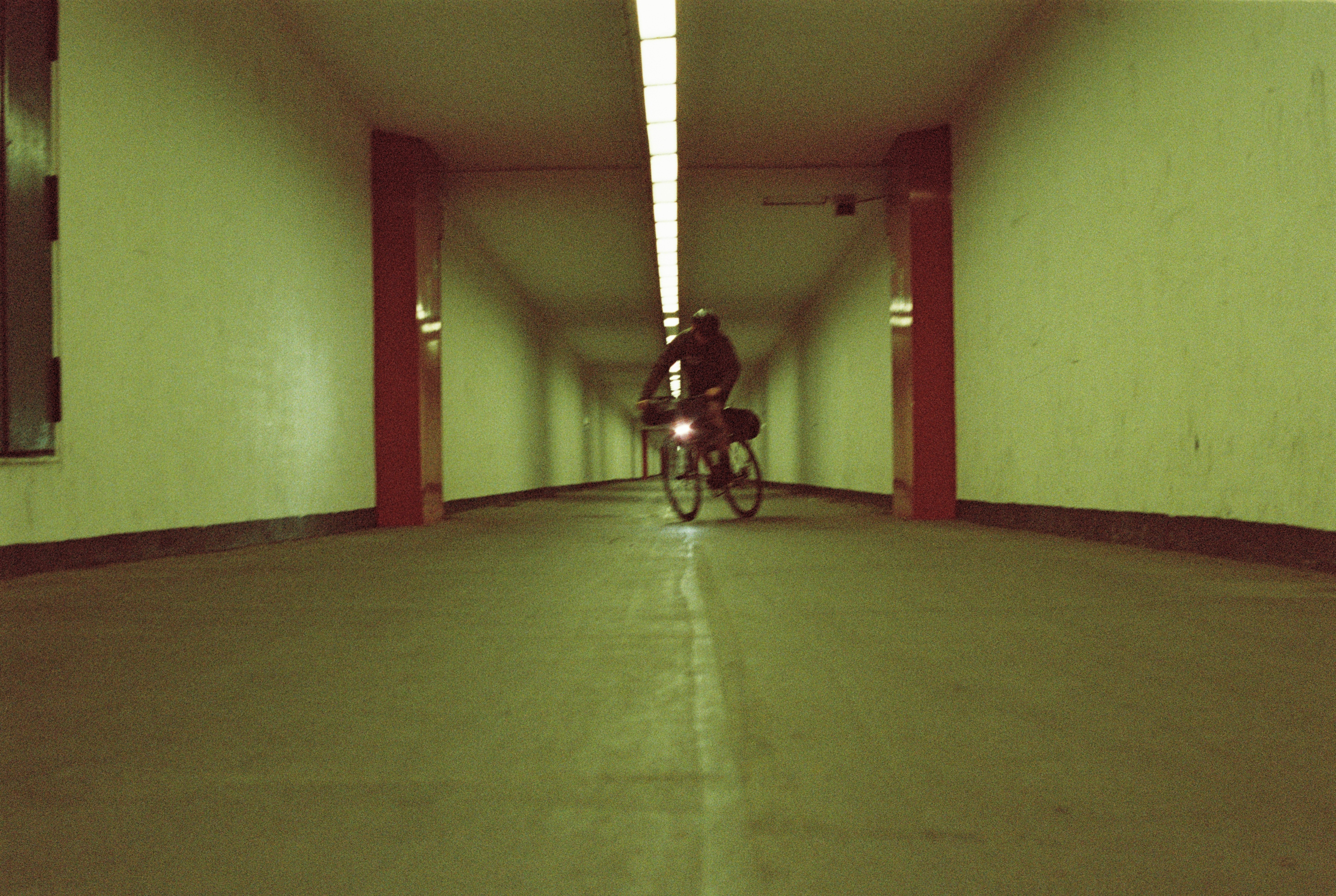 The route ran parallel to the train: linear, monotonous. Fragments of chicane offered at each intersection were relished. The glow of headlights as night fell and the acrid exhaust of cars were a grotesque relief. There is, however, a mystique to riding at night. A sea change, but faster – an air change. The visual world contracts. Conduits and vessels laid in wait, deep behind the eyes, hitherto unfelt, dilating, rerouting. Sounds and smells intensify. Proprioception relocated – the stochastic dance of rubber against asphalt, tarmac, grit, dirt. Particles hurtling through space.